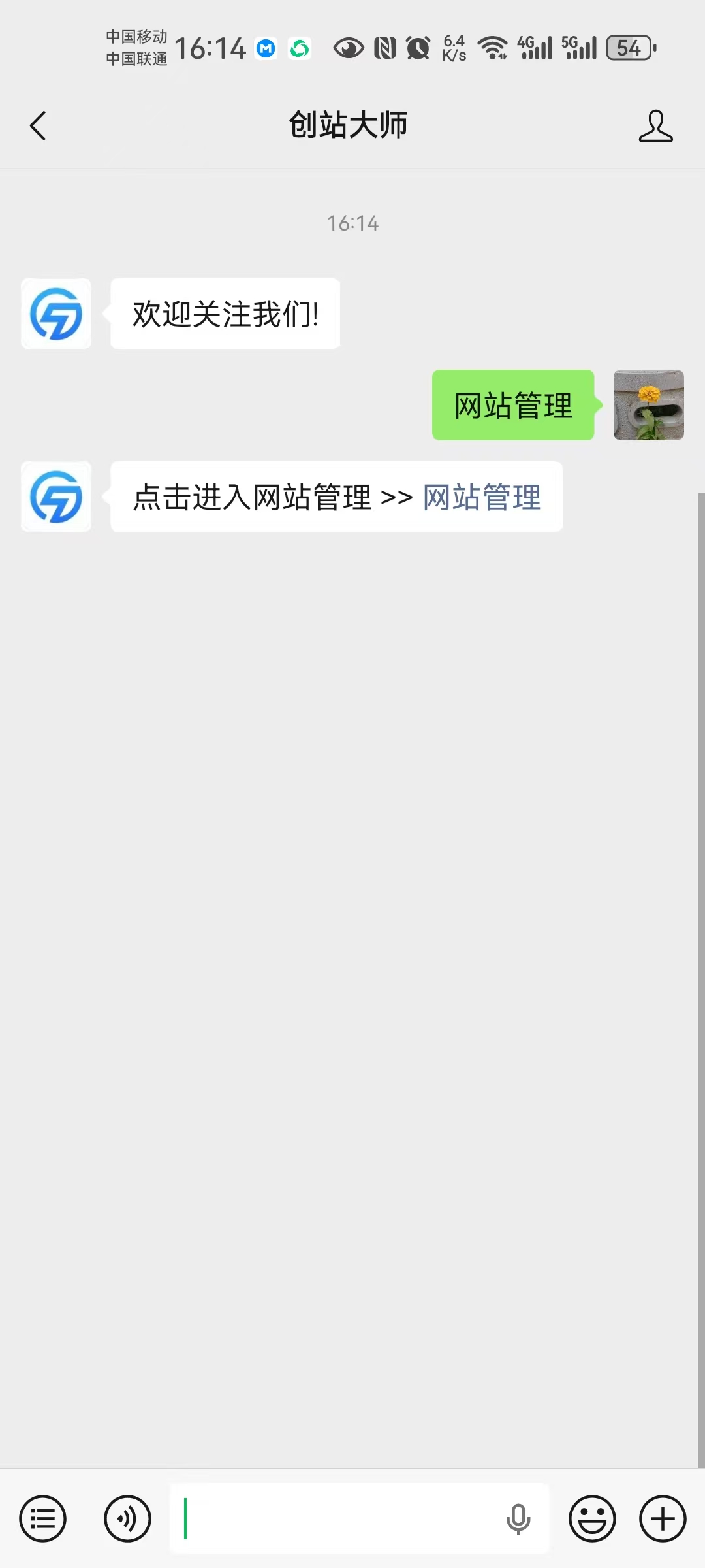 2、关注公众号并进入,回复“网站管理”